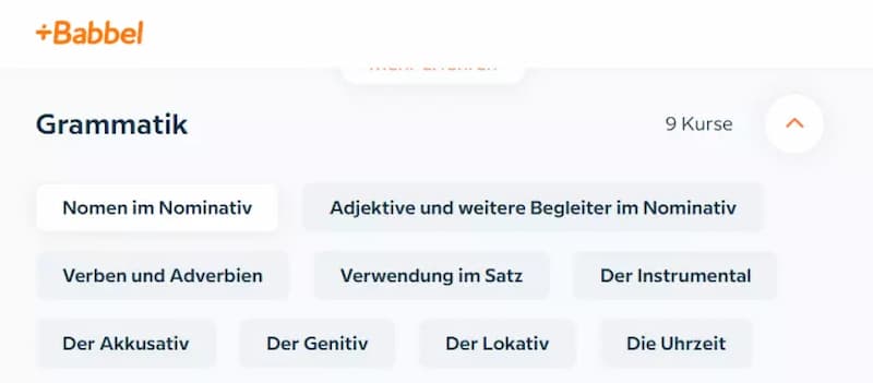 Grammatische Themen wie Fälle, Verbformen, Zeitformen und Adjektivendungen werden konsequent in diese Alltagssituationen eingebettet. Besonders geschätzt wird, dass Babbel schwierige Inhalte nicht isoliert behandelt, sondern immer im Zusammenhang mit praktischer Anwendung vermittelt.