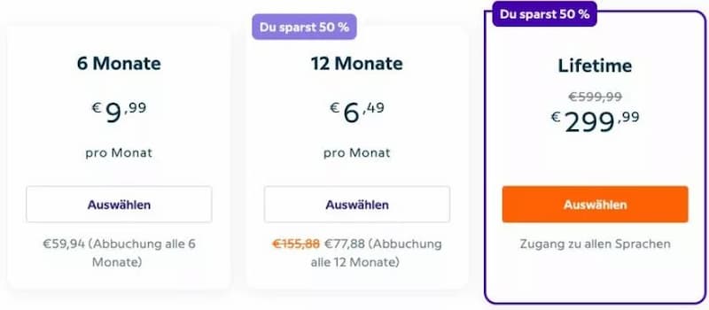 Zusätzlich bietet Babbel ein Lifetime-Abo an. Dieses kostet einmalig 299,99 Euro und gewährt unbegrenzten Zugriff auf alle Sprachen, die Babbel anbietet. Für Lernende mit langfristigen Sprachlernzielen oder Interesse an mehreren Sprachen kann sich diese Option lohnen.