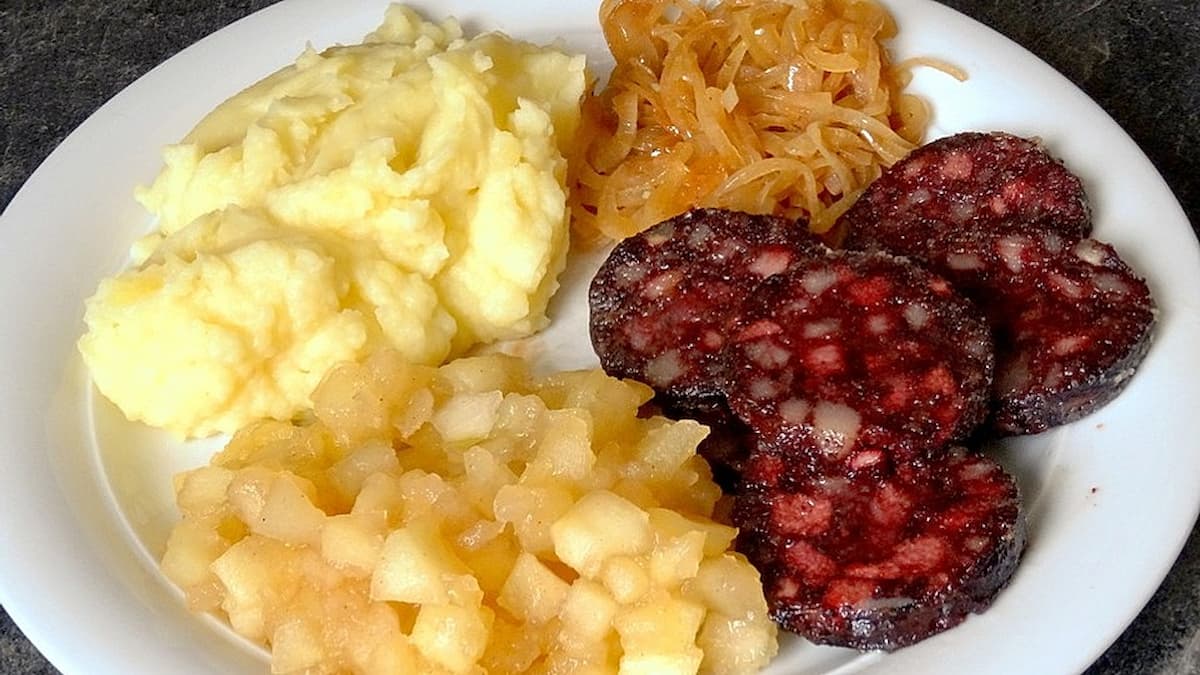 Die Basis aus Kartoffelbrei und Apfelmus wird in Nordrhein-Westfalen traditionell mit gebratener Blut- oder Leberwurst und gerösteten Zwiebeln serviert. „Himmel und Äd“ ist ein klassisches Beispiel für bodenständiges und stärkendes deutsches Essen.