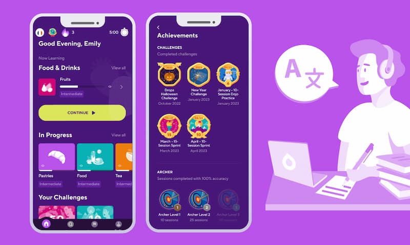 - Drops Topics: Diese Funktion erlaubt es Ihnen, die Lerninhalte an Ihre persönlichen Interessen anzupassen. Sie können aus über 180 Themen wie Essen, Sport oder Kunst wählen, um sicherzustellen, dass Sie Vokabular lernen, das für Sie relevant ist.