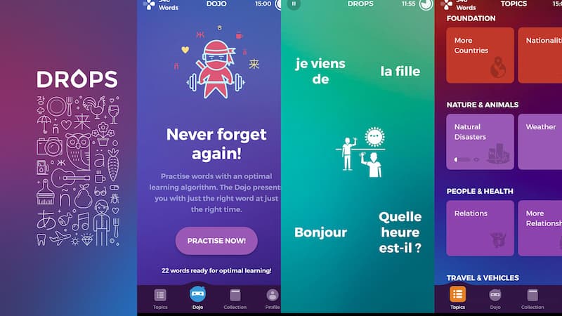 - Review Dojo: Diese Wiederholungsfunktion ist ein wichtiger Bestandteil des Konzepts von Drops Sprachen Lernen. Die App nutzt einen wissenschaftlich basierten Algorithmus, um Ihnen gelernte Wörter zum optimalen Zeitpunkt erneut zu präsentieren. Dies zielt darauf ab, das Langzeitgedächtnis zu fördern und sicherzustellen, dass die Vokabeln dauerhaft sitzen.