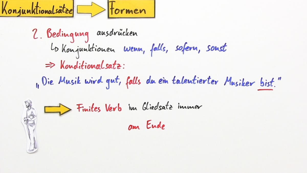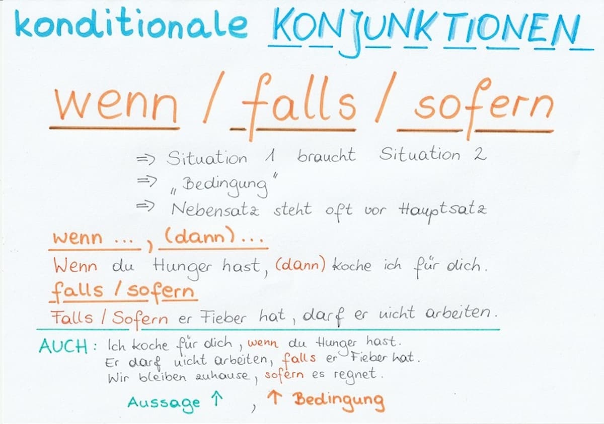 - Die Bedingung steht typischerweise im Nebensatz, eingeleitet durch die Subjunktion „wenn“ (oder Alternativen wie falls).