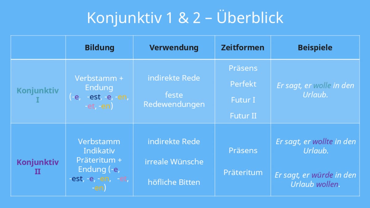 - Konjunktiv I: Dieser wird primär zur Wiedergabe von Aussagen in der indirekten Rede verwendet.