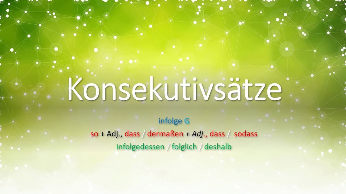 Konsekutivsatz Übungen sollten sich auf die Transformation von zwei einfachen Hauptsätzen in ein komplexes Satzgefüge konzentrieren, wobei stets auf die korrekte Position des finiten Verbs geachtet werden muss.