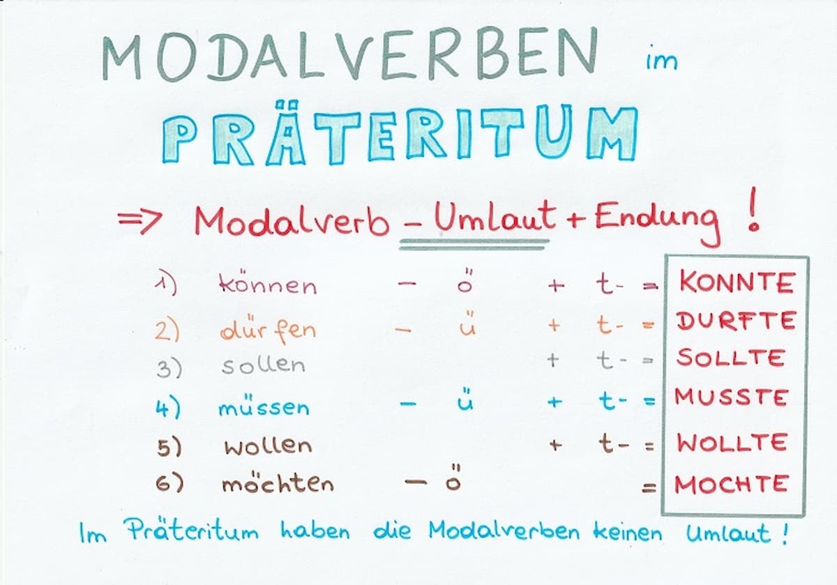 Das Präteritum (einfache Vergangenheit) wird vor allem in der Schriftsprache und bei Berichten verwendet. Die Konjugation der Modalverben im Präteritum ist ebenfalls unregelmäßig. Sie behalten ihren Stammvokal, bekommen aber die typische Präteritumsendung -te. Wichtig ist, dass die Singularformen im Präteritum keine Umlaute haben.