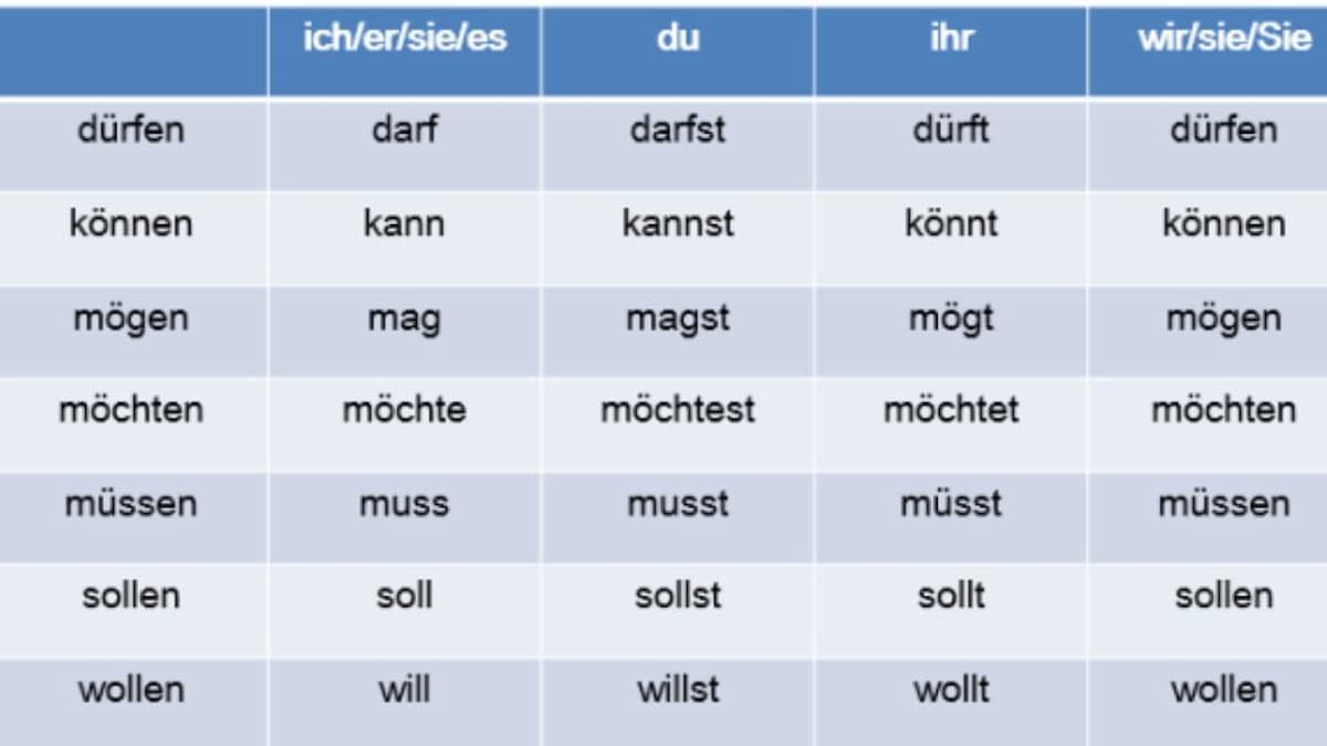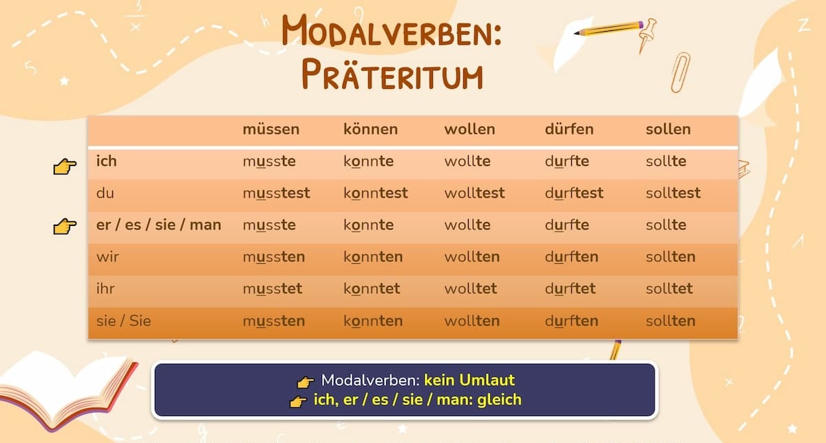 - Präteritum-Stämme: konnte, musste, durfte, wollte, sollte, mochte.
