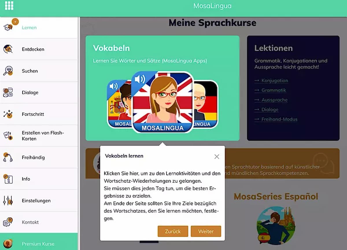 Mosalingua ist eine Sprachlern-App und Online-Plattform, die sich auf Vokabeltraining, nützliche Phrasen und wiederholungsbasiertes Lernen konzentriert. Der Fokus liegt stark auf dem praktischen Wortschatz für Alltag und Beruf.