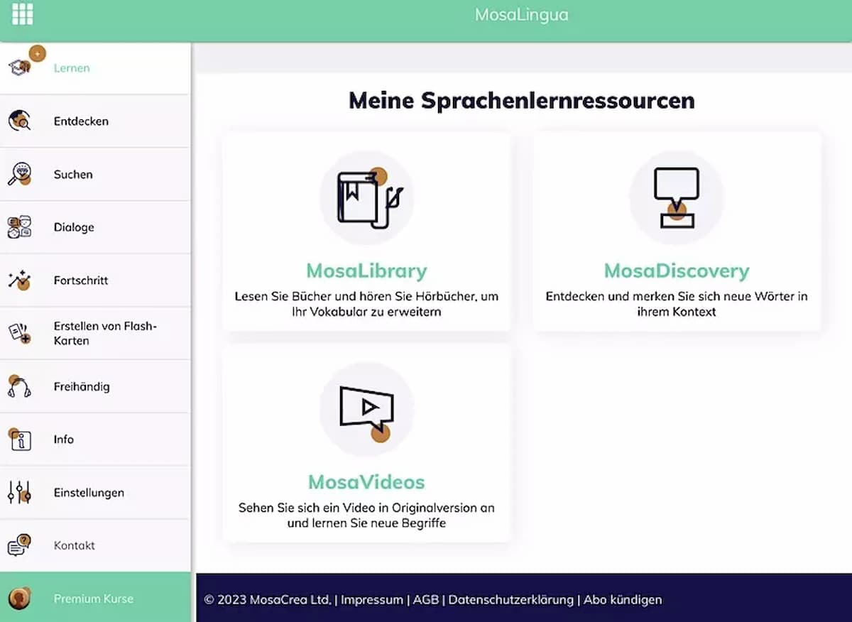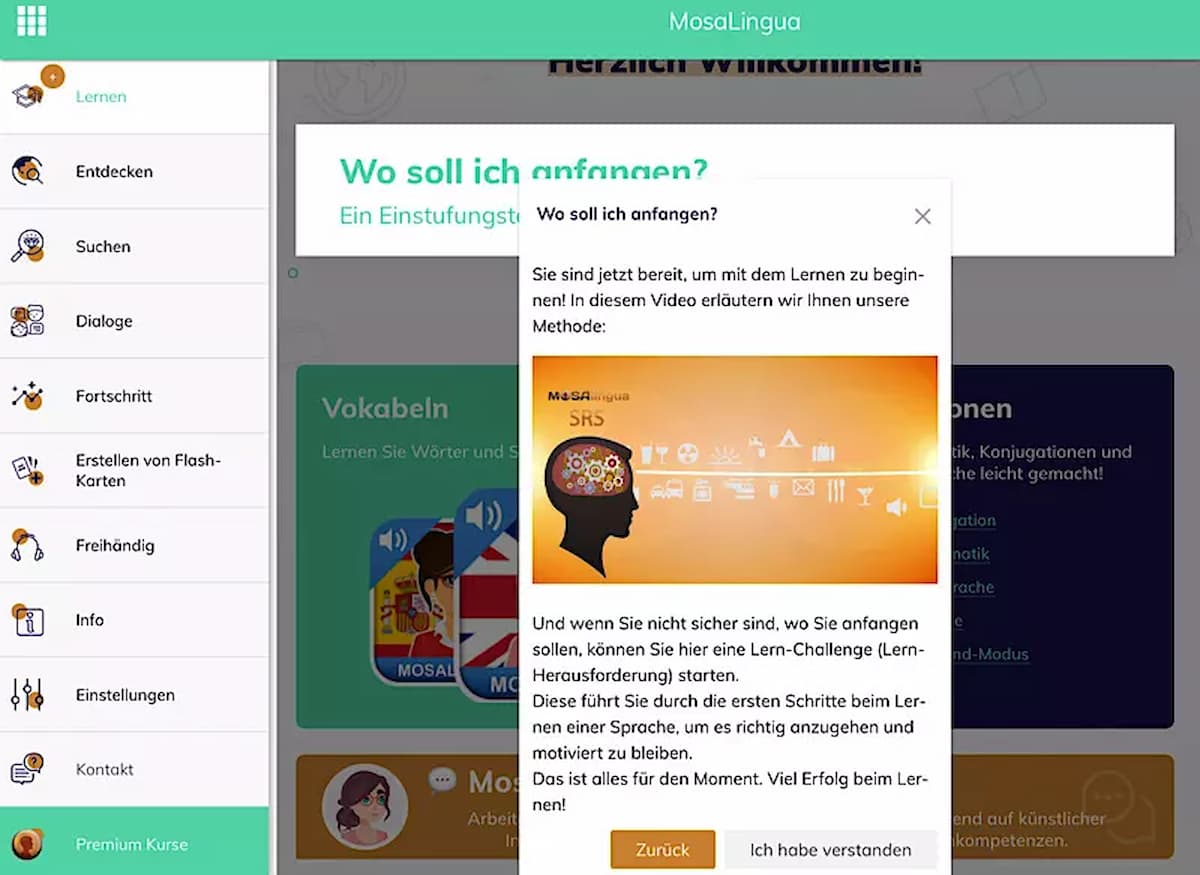 Die ersten Schritte sind schnell erledigt: Konto anlegen, Sprache wählen, Abomodell aussuchen, Testphase starten. Positiv in vielen Mosalingua Erfahrungen erwähnt: Du wirst schon nach wenigen Klicks in die Lernumgebung geführt, ohne lange Formulare.
