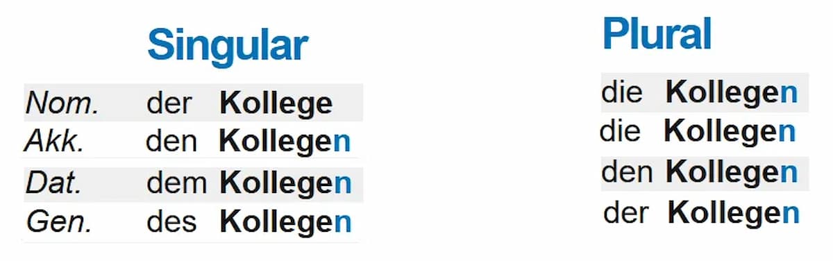 - Beispiel: der Kandidat (Plural: die Kandidaten) $\rightarrow$ des Kandidaten