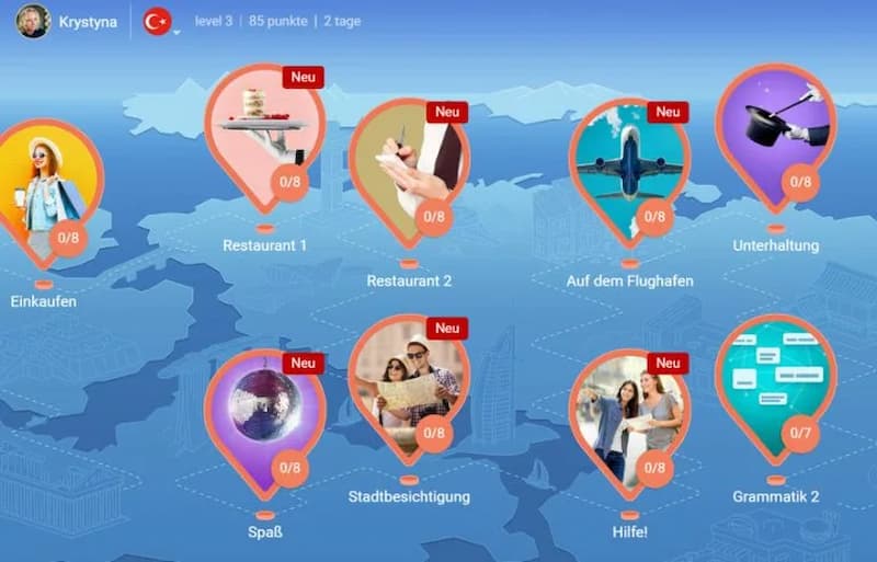 Mondly setzt voll auf das Konzept der Gamification. Das bedeutet, dass der Lernprozess wie ein Videospiel aufgebaut ist. Man sammelt Punkte, steigt in Levels auf und kann sich in Bestenlisten mit Freunden oder anderen Nutzern weltweit messen. Diese spielerischen Elemente sind darauf ausgelegt, die Motivation hochzuhalten. Die Lektionen sind kurz und kurzweilig, was sie ideal für zwischendurch macht.