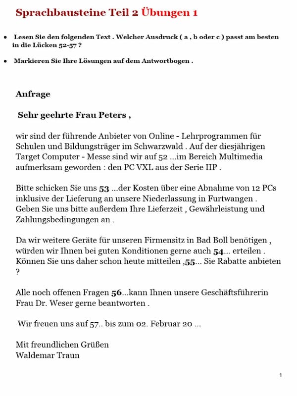 - Sprachbausteine: Hier steht die Kenntnis grammatischer Strukturen und des berufsbezogenen Wortschatzes im Fokus. Die Teilnehmenden müssen in Lückentexte die passenden Wörter oder Redewendungen einfügen, um die Textkohärenz wiederherzustellen. Diese Aufgaben stellen sicher, dass die Teilnehmenden die richtigen sprachlichen Mittel für den beruflichen Kontext auswählen können.