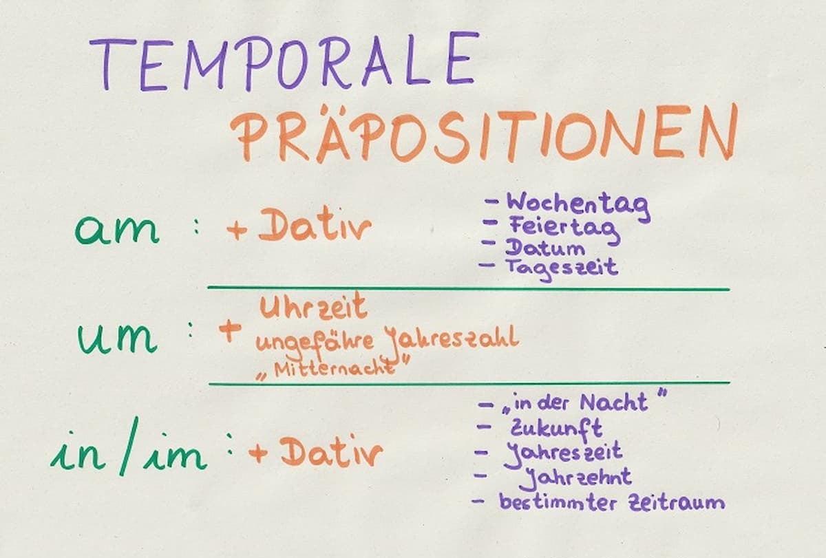 Die wichtigsten und am häufigsten verwendeten temporale Präpositionen sind: an, ab, bei, mit, seit, nach, bis, in, um, von, vor, zwischen, während, innerhalb und gegen. Die korrekte Anwendung dieser Präpositionen ist jedoch untrennbar mit der Beherrschung des richtigen Kasus verbunden.