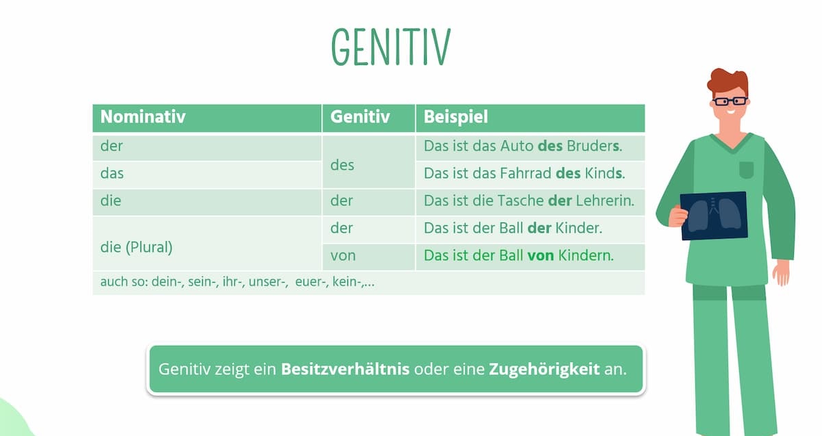 Bevor wir uns die konkreten Verben anschauen, rufen wir uns kurz die Bedeutung des Genitivs ins Gedächtnis. Der Genitiv ist der zweite Fall in der deutschen Grammatik. Die Frage, mit der man nach ihm sucht, lautet wessen. Er drückt meistens Zugehörigkeit, Besitz oder eine Herkunft aus.